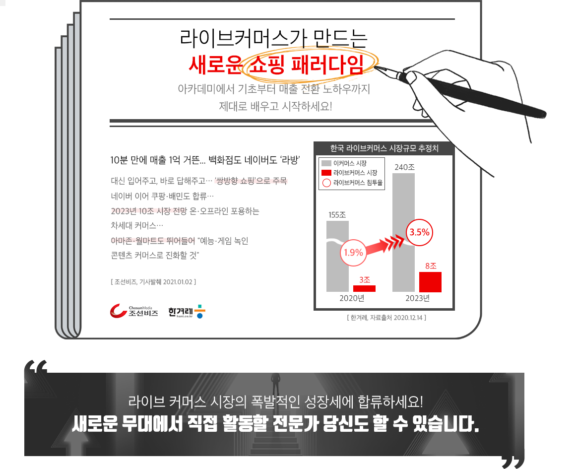 이론과 실습을 한번에 해결하는 교육! 라이브커머스 대한 완벽한 이해를 바탕으로 바로 실전에 투입될 수 있는 교육과 아카데미만의 인프라와 셀러 지원 프로그램으로 당신도 주인공이 될 수 있습니다.
